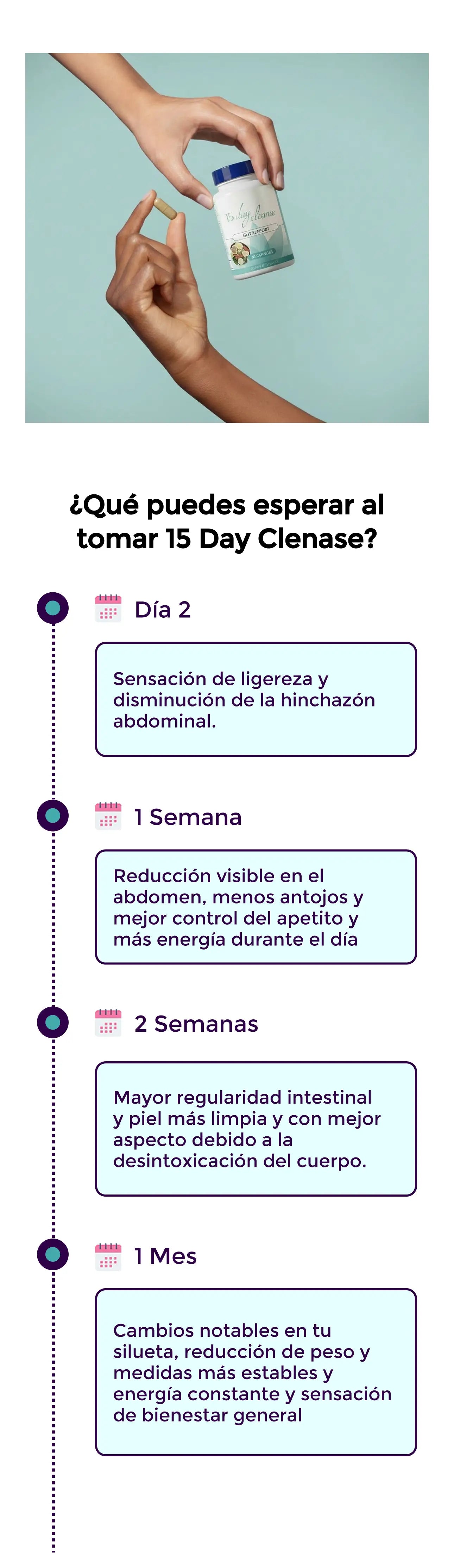Desde los primeros días notarás menos hinchazón y mejor digestión. Los resultados más visibles aparecen entre la primera y segunda semana de uso.